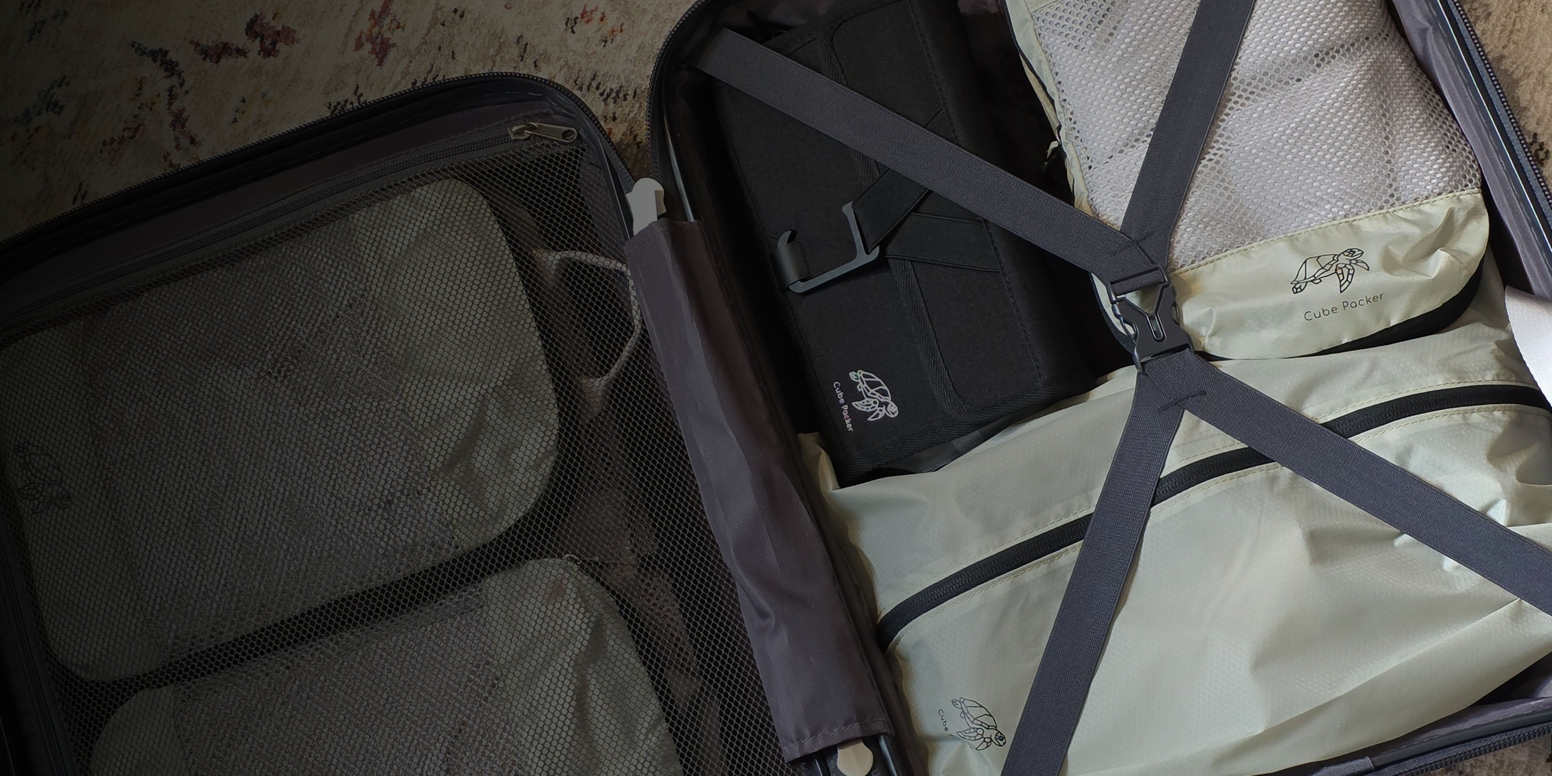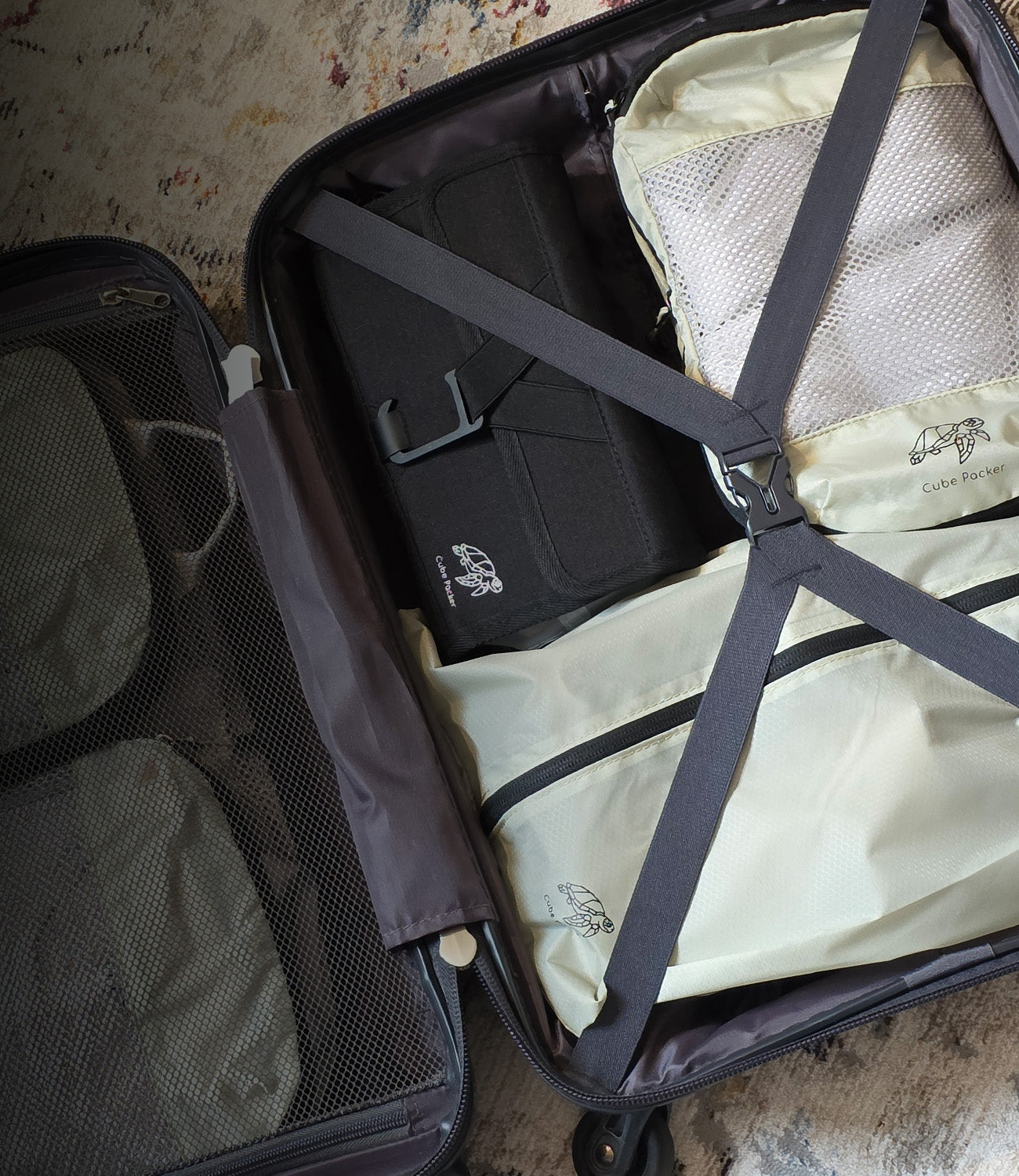 Includes a set of compression packing cubes, a dedicated shoe bag, laundry bag, and a compact toiletries bag.